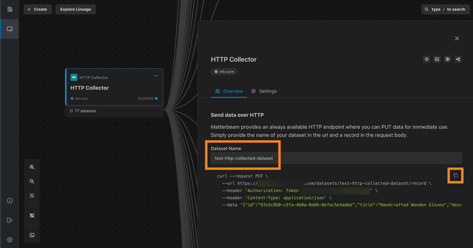 From the Matterbeam UI, click on the "HTTP Collector" component, type in a "Dataset Name", then copy the code using the copy icon.