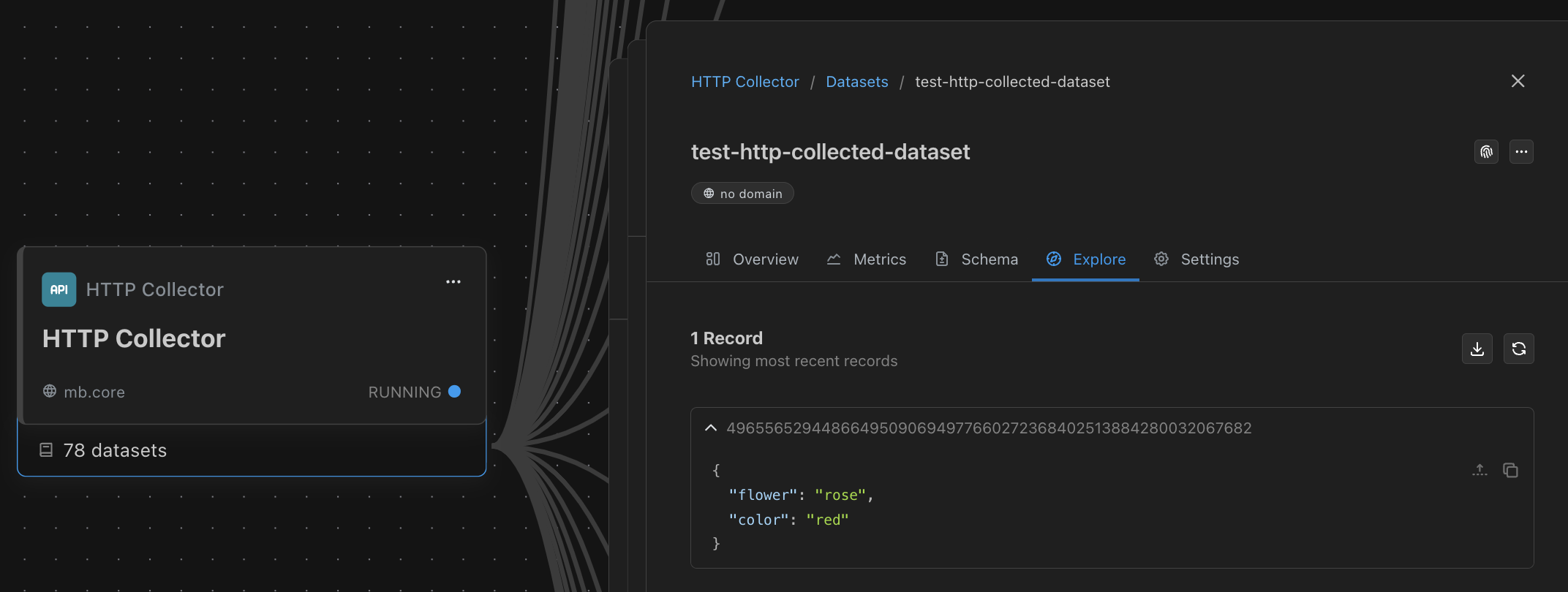 --data '{"flower": "rose","color": "red"}'Here is how the dataset will appear in Matterbeam: