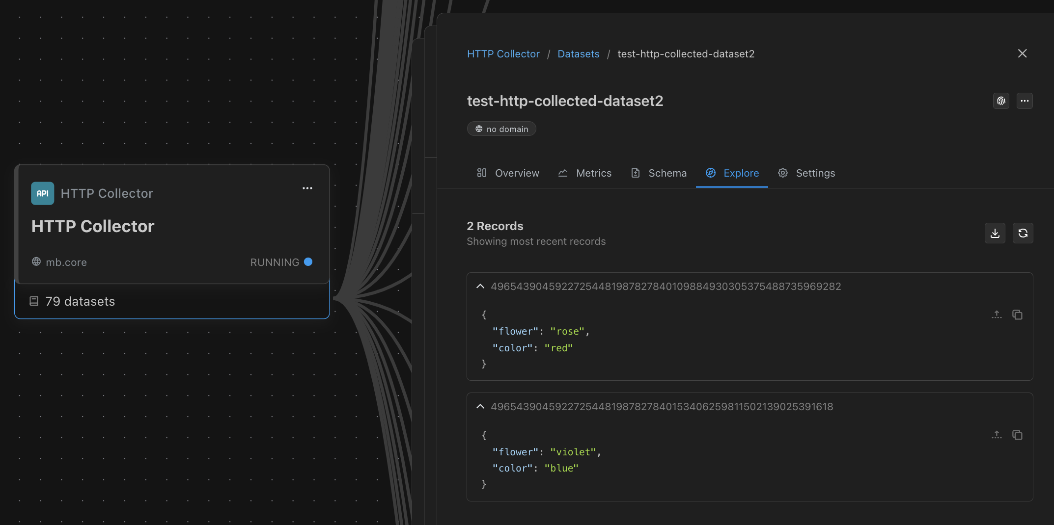 --data '[{"flower": "rose","color": "red"},{"flower": "violet","color": "blue"}]'Here is how the dataset will appear in Matterbeam:
