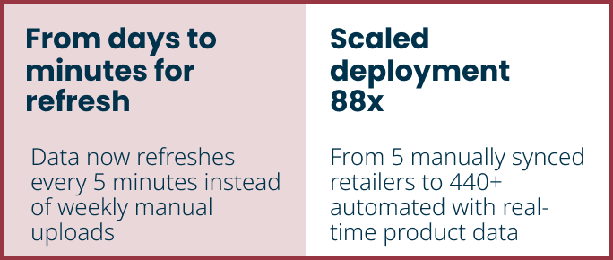 Scaling from 5 retailers to 440+. Cyncly struggled to manage manual file uploads for just 5 retailers. With Matterbeam’s automated data flows, they’re scaling to 440+ retailers without adding operational headcount.